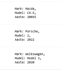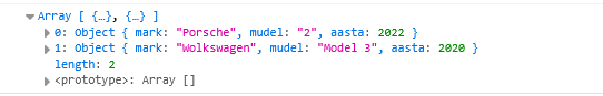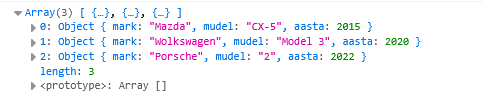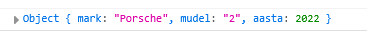 { mark: 'Porsche', mudel: '2', aasta: 2022 },