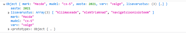 { mark: 'Mazda', mudel: 'CX-5', aasta: 2015 },