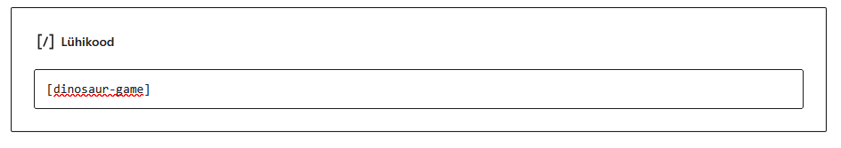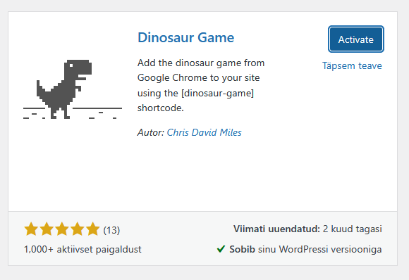 See plugin lisab populaarne Dinosaur Game Google-ist, mille lihtsalt lisatakase veebilehele lühikoodiga nagu siin: