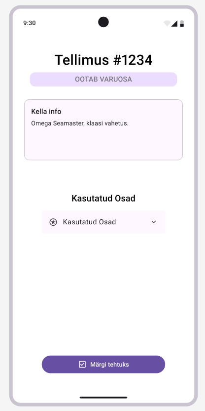 See ekraan kuvab ühe konkreetse parandustöö andmed. Siin on näha kella mudel, kliendi soov, remondi staatus ja kasutatud varuosad. Kellassepp saab siin vaates muuta töö staatust (näiteks “Töös” -> “Valmis”) ja salvestada andmebaasi tehtud muudatused.