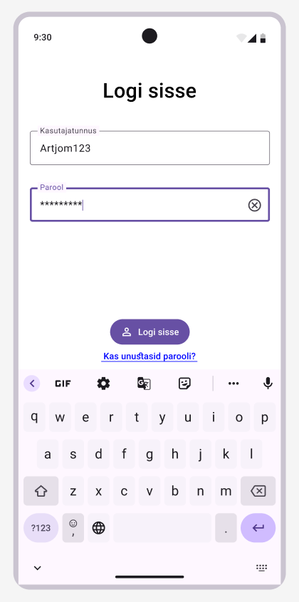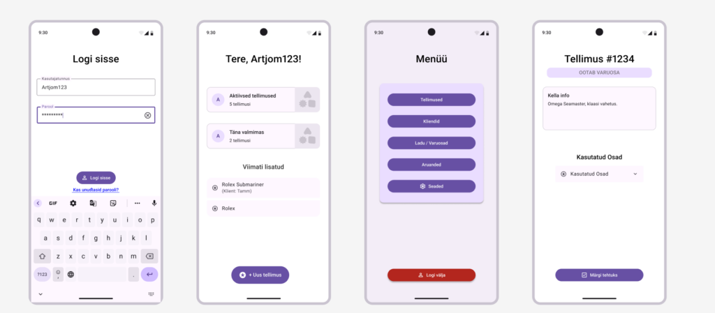 - Ekraanid (Screens) – joonised või visuaalsed raamid, mis kujutavad rakenduse erinevaid vaateid (näiteks sisselogimine või avaleht).