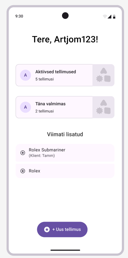 Pärast sisselogimist avaneb töölaud, mis annab kiire ülevaate päeva seisust. Siin kuvatakse olulisemad teavitused, näiteks ootel olevate tellimuste arv ja tänased tähtajad. Avalehelt saab kiiresti liikuda uue tellimuse vormistamise juurde.