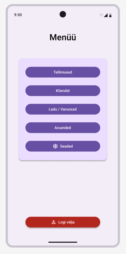 Menüüvaade võimaldab kasutajal liikuda rakenduse erinevate osade vahel. Siit saab valida, kas soovitakse näha klientide nimekirja, laoseisu (varuosad), tehtud tööde ajalugu või muuta seadeid. Menüü on üles ehitatud loogiliselt, et navigeerimine oleks kiire.